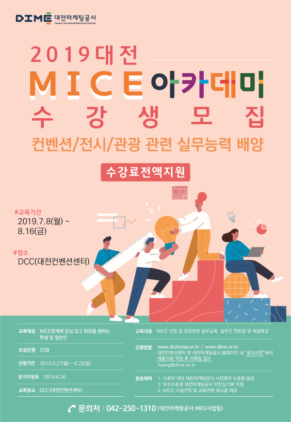 서비스로 하늘과 땅을 지배하라!2019 대전 MICE 아카데미 수강생을 모집하고 있습니다. 관심있는 학생들의 많은 참여 바랍니다.