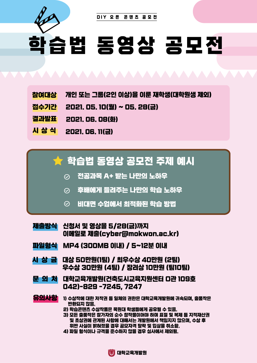 목원대학교에서는 지난 5월 10일부터 2021-1학기 DIY 오픈 콘텐츠 공모전을 실시해 접수 중이다.