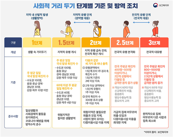 다음은 개편된 사회적 거리두기에 대해 알아보자. 사회적 거리두기 개편은 코로나 바이러스가 장기화되고 있는 상황에서 지속 가능한 사회적 거리두기를 위한 개편이다. 기존 3단계 체계는 5단계로 세분화 하여 운영하고, 1단계는 생활 방역, 2.5단계 및 3단계는 전국적인 유행을 대비한 것이다. 또한 1단계 방역 수칙 의무화 영역을 확대하였다.
