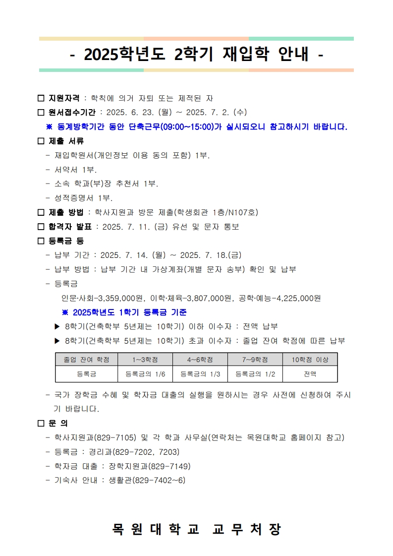나. 제출서류: 재입학원서, 추천서, 서약서, 성적증명서 각 1부.