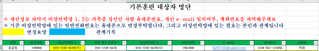 비상 연락망 1,2 본인 핸드폰번호 , 계좌번호 8297730@naver.com 학과 이메일로