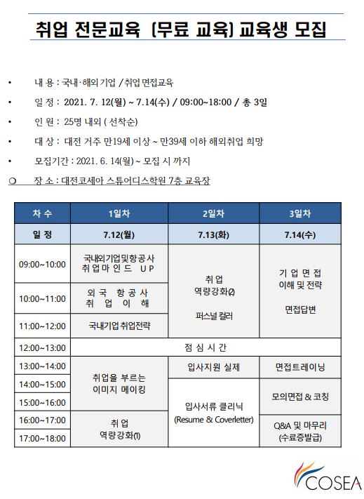 3) 내 용 : 국내・외 기업 취업이해&전략 , 이미지메이킹, 취업역량 강화, 입사서 류 클리닉, 면접 트레이닝, 모의면접&개별코칭