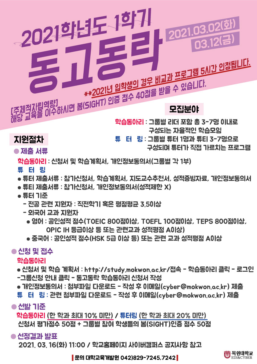1) 학습동아리 : 온라인 신청 [ http://study.mokwon.ac.kr/ ]