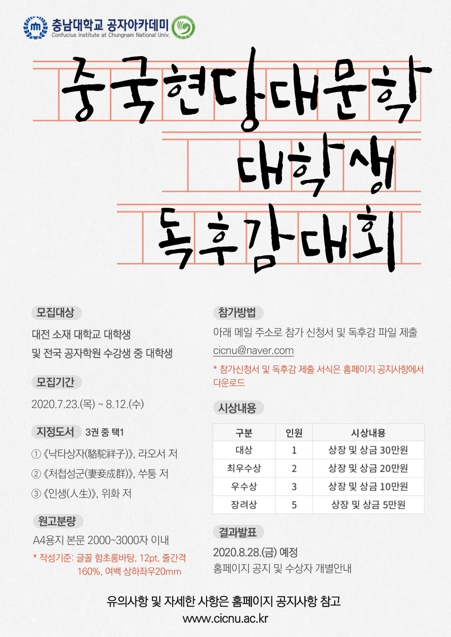 言語を学び、文化を理解し、世界に出よう!,学习语言,了解文化,走向世界!충남대학교 공자학원에서는 독서를 통한 대학생의 중국 문화 이해도 향상과 인문학 역량강화를 위하여 다음과 같이 2020년 중국현당대문학 대학생 독후감 대회를 개최하고자 합니다.