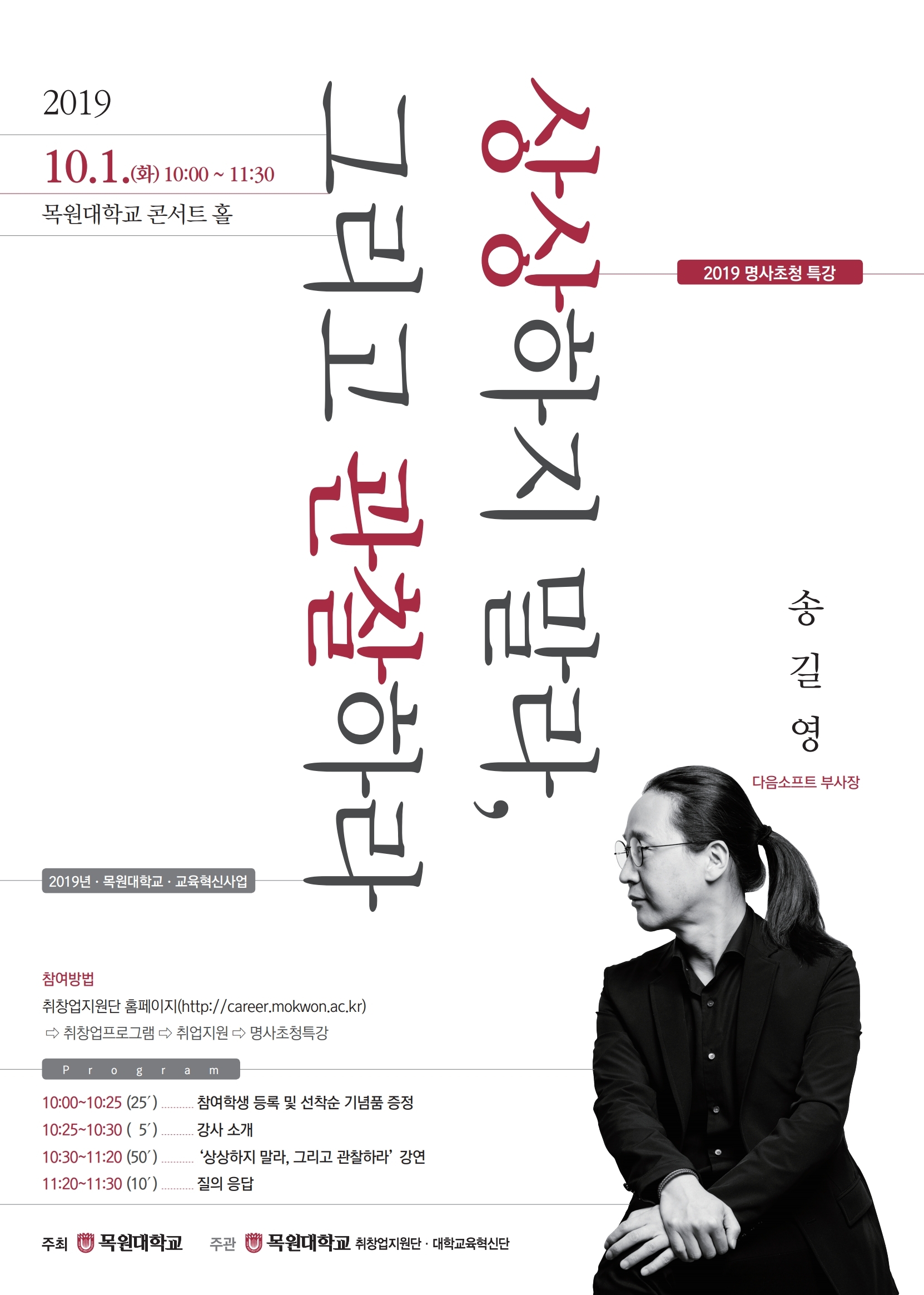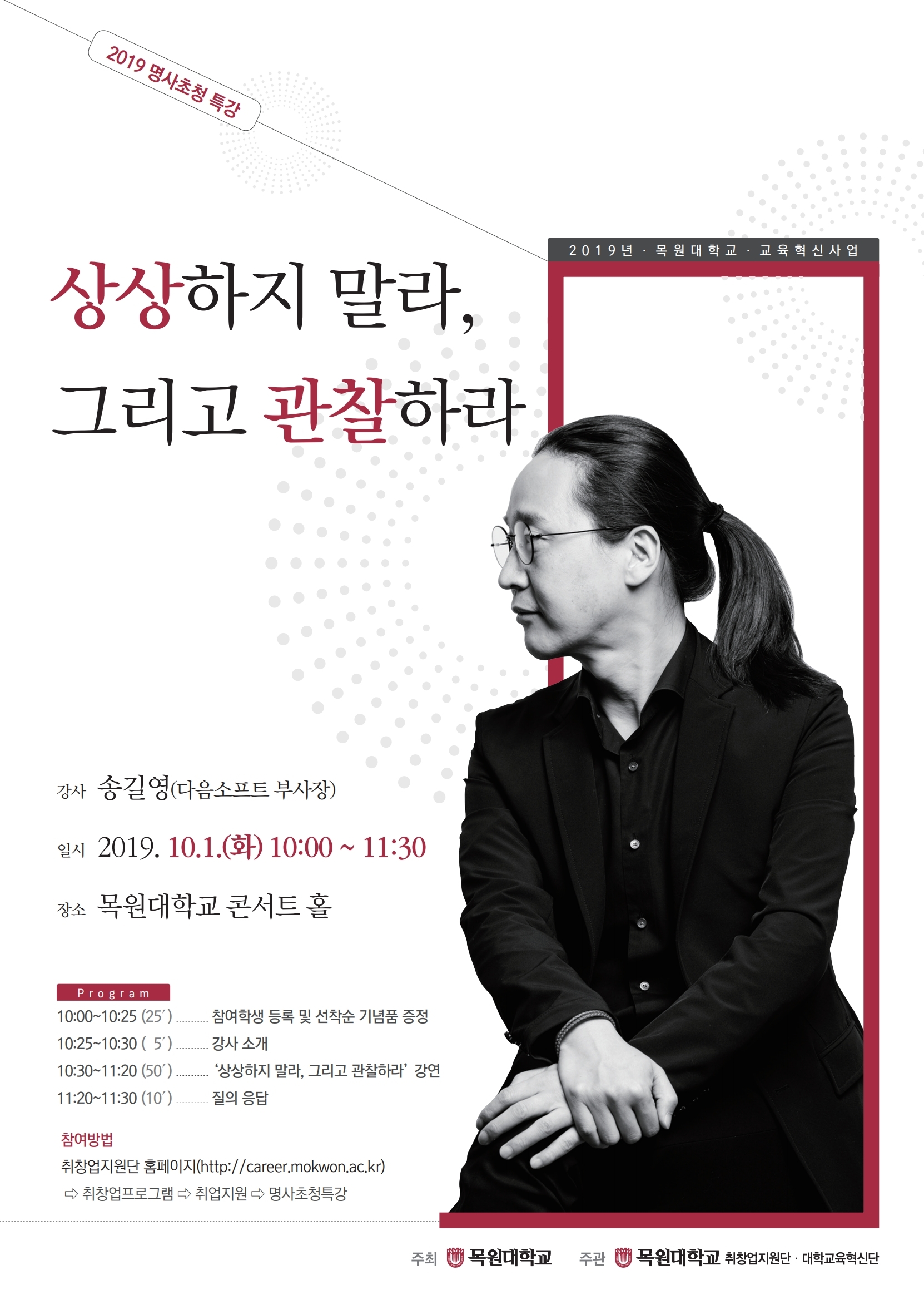 1) 취창업지원단 홈페이지(http://career.mokwon.ac.kr) >> 로그인 >> 취창업프로그램 >> 취업지원 >> 2019 명사초청특강 신청