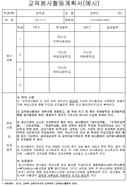 교육봉사활동 학사관리 관련 교육부 규정의 개정으로 기존에는 제출하시지 않았던 교육봉사활동 계획서가 추가되었습니다.