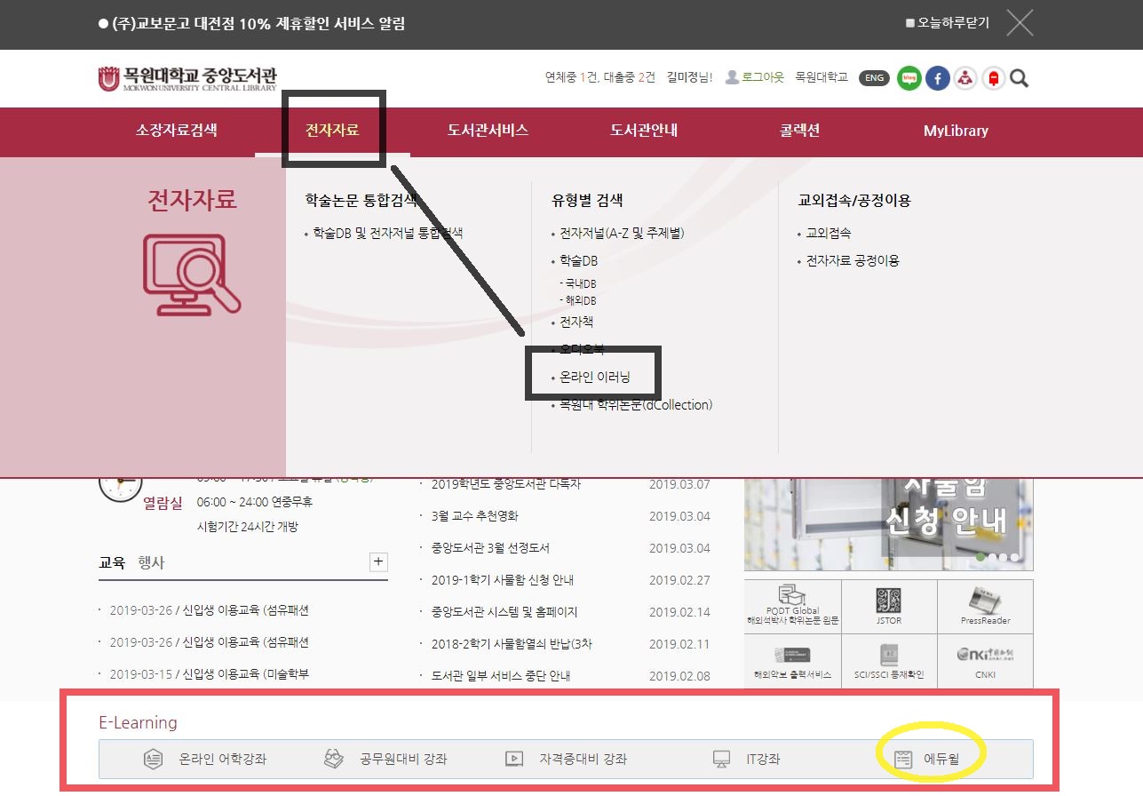 2) 메인화면 하단 및 전자자료>이러닝 메뉴클릭, 에듀윌 이용