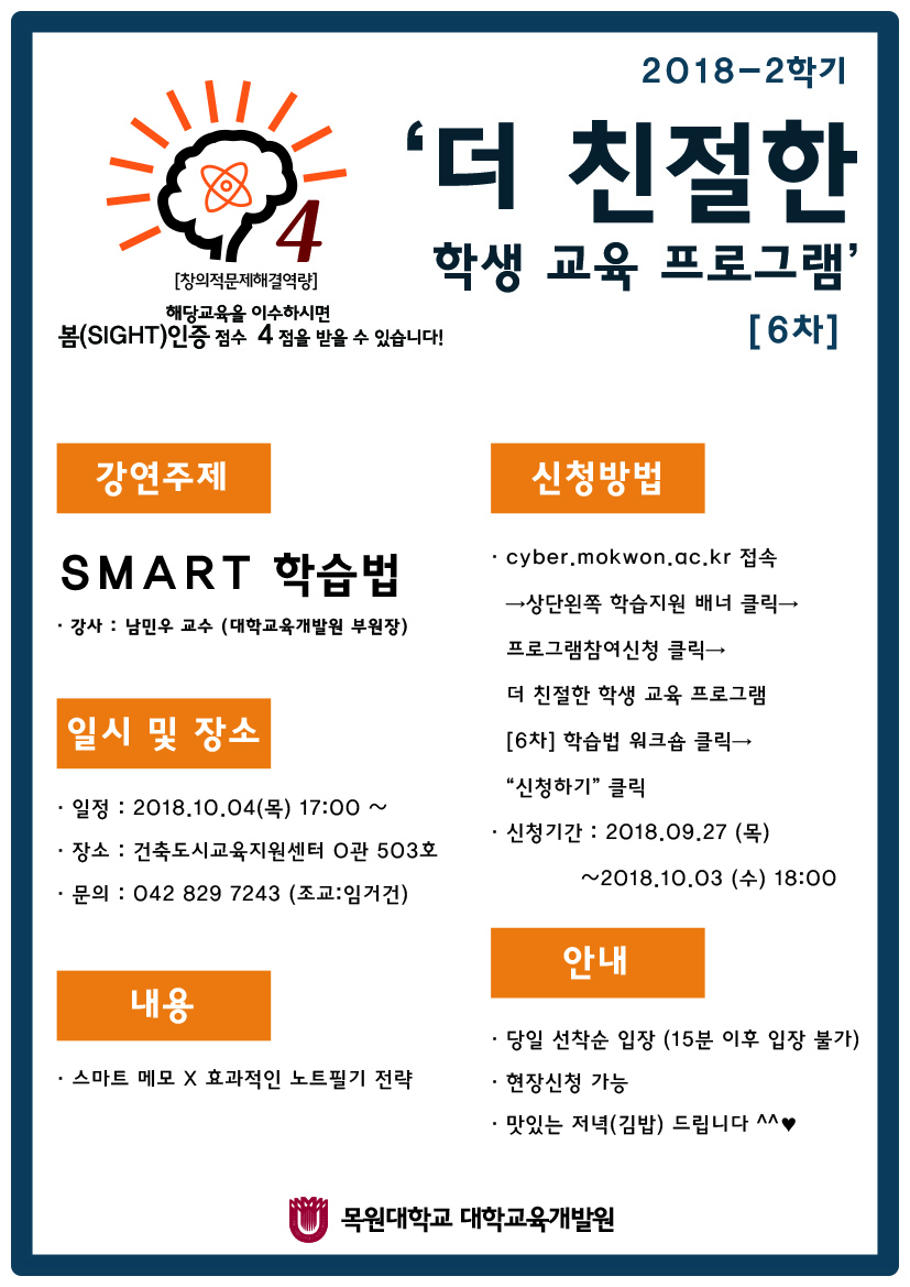 본 원의 ‘더 친절한 학생 교육 프로그램’은 학생들의 학습역량 강화 및 학습동기 유발을 위해 학기별로 8회 내외의 학습법 워크숍이 운영될 예정이며, 이번 [6차] 워크숍 주제는 스마트 메모 및 효과적인 노트필기 전략에 대한 교육으로 많은 학생들이 참여 할 수 있도록 안내 바랍니다.