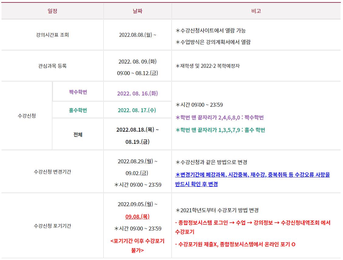 2022학년도 2학기 수강신청 일정 및 수강신청 방법을 아래 내용 및 첨부 파일과 같이 안내드리오니 참고(필독)하여 수강신청에 유의하시기 바랍니다.