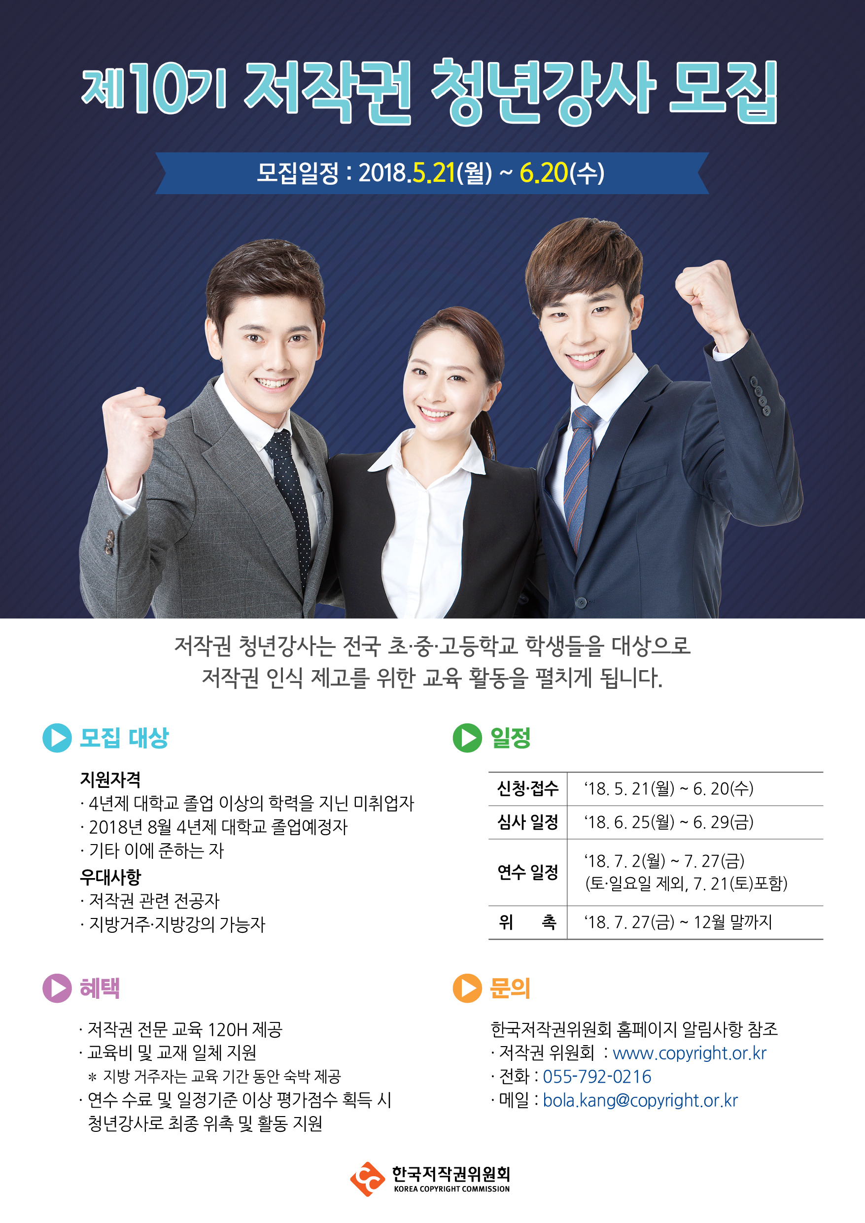 한국저작권위원회는 저작권법에 근거하여 설립된 문화체육관광부 산하 공공기관이며, 저작권 교육 및 홍보, 정책연구 등의 업무를 수행하고 있습니다. 오늘날 청소년의 저작권 인식 제고를 위한 저작권 교육의 필요성이 나날이 높아지고 있어, 우리 위원회에서는 저작권 전문지식과 강의 역량을 갖춘 저작권 청년강사를 양성하여 전국 초·중·고등학교 현장에 투입하고 있습니다.