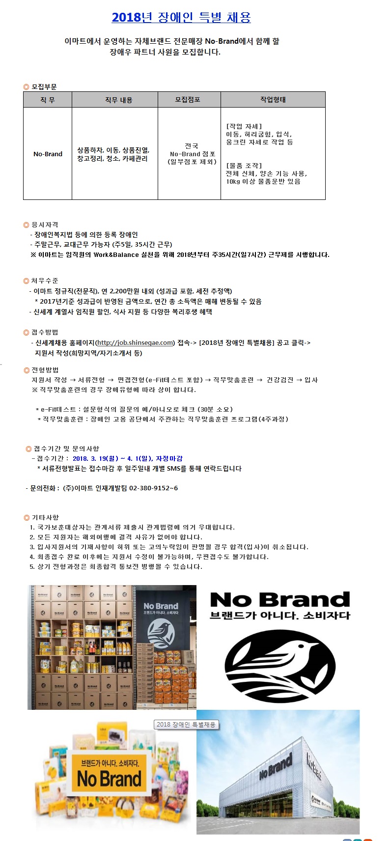 ONE STEP AHEAD!한국장애인고용공단은 고용노동부 산하 준정부기관으로 장애인 고용의무제도의 이행지원을 위한 취업지원 및 기업지원 업무를 수행하고 있으며, 이번에 대기업 내 장애인을 위한 좋은 일자리 확대를 위하여 다음과 같이 2018년 3월이마트 장애인 특별채용을 안내하오니 관심있는 분들의 많은 지원 바랍니다.