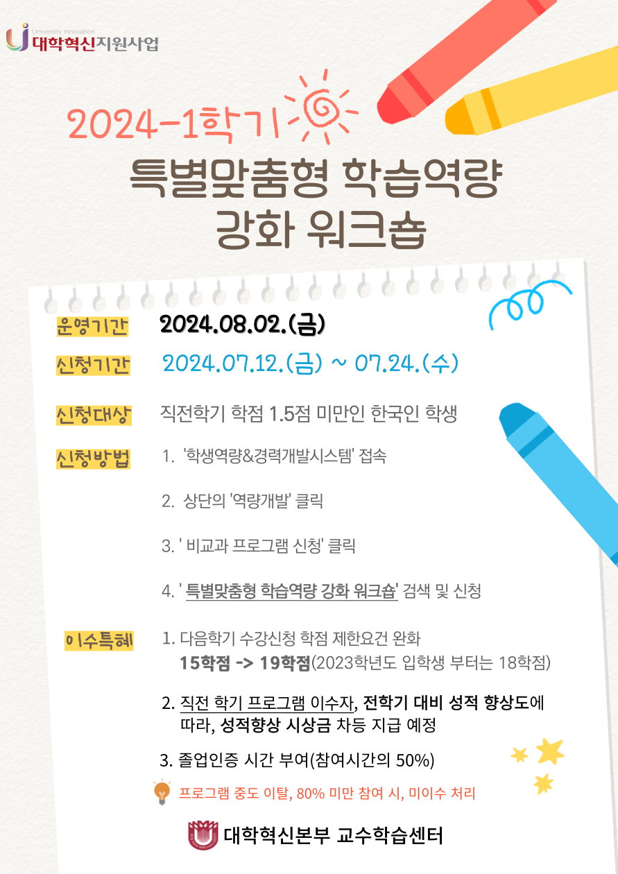 대학혁신본부 교수학습센터에서 2024학년도 1학기 특별맞춤형 학습역량 강화 워크숍을 운영할 예정이오니, 대상 학생들의 많은 참여 바랍니다.