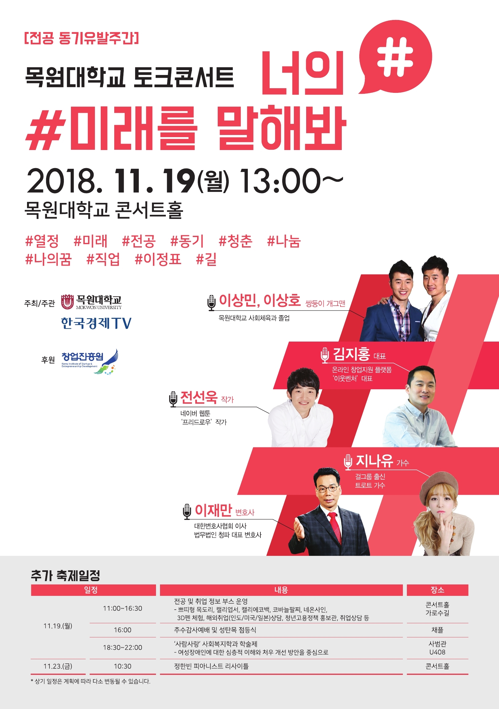 사. 참여방법: 취창업지원단 홈페이지(http://career.mokwon.ac.kr) >> 로그인 >> 취창업프 로그램 >> 취업지원 >> 24번 ~ 토크콘서트 ‘너의 #미래를 말해봐’ 신청