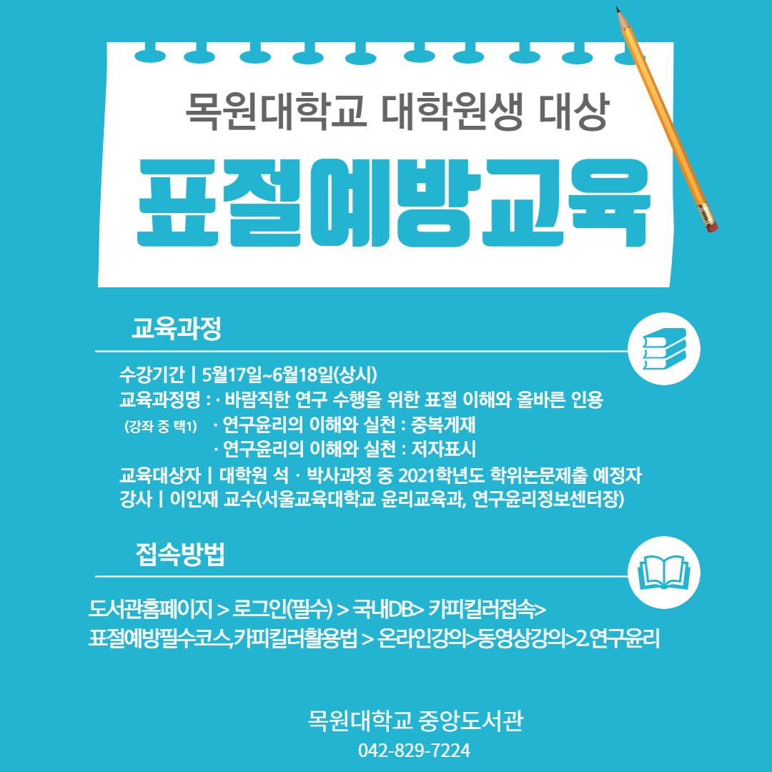 1. 접속방법 : 목원대학교 중앙도서관 홈페이지 > 로그인 > (우측하단) 카피킬러 접속 > 표절예방 필수코스, 카피킬러 활용법 > 온라인강의 > 동영상강의 > 2. 연구윤리