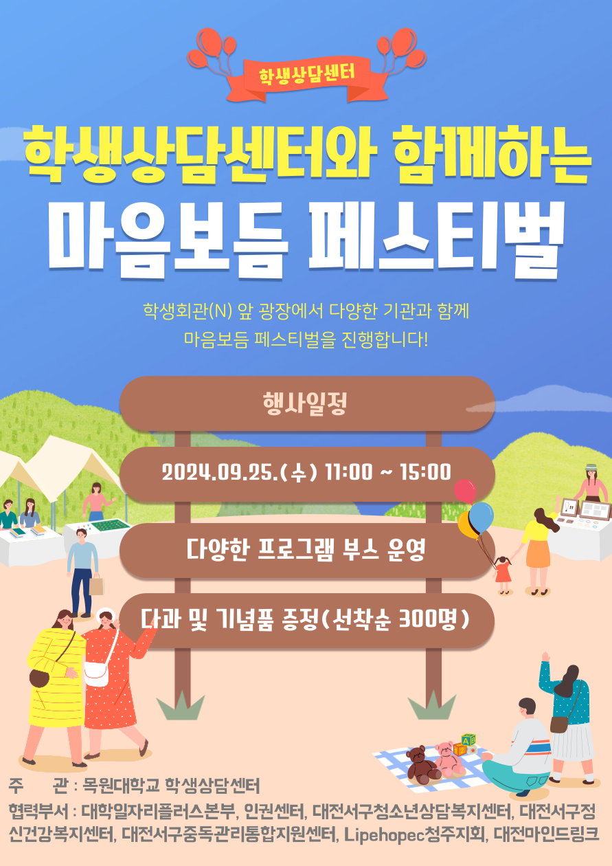 글로벌 인재를 양성하는, 여기는 영어학과학생처 학생상담센터에서는 대학혁신지원사업과 관련하여 지역사회 유관기관과 협력하여 재학생들에게 심리·정서·진로 지원을 위한 마음보듬 페스티벌을 개최하고자 합니다. 이에 아래와 같이 프로그램을 진행하고자 하오니 많은 관심 부탁드립니다.