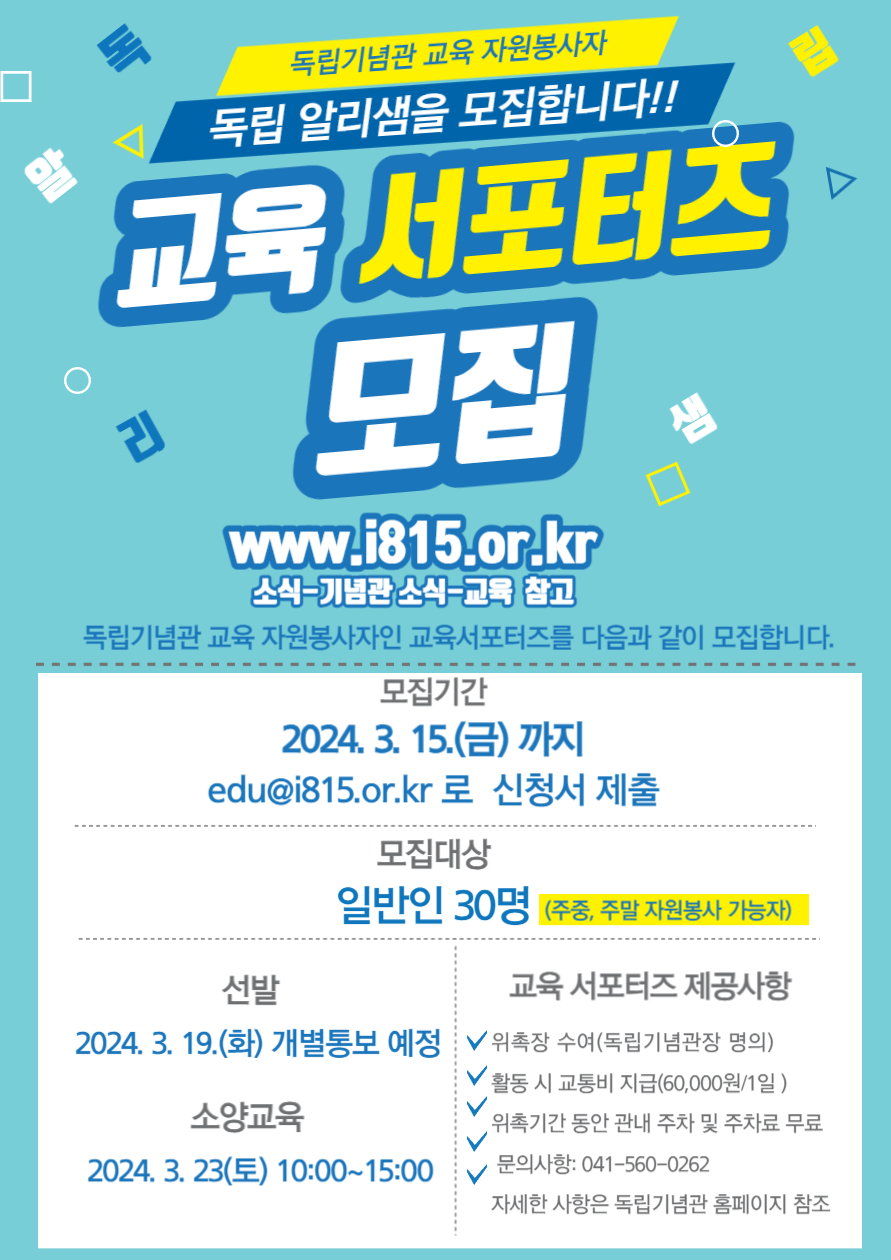 THE GRADUATE SCHOOL OF독립기념관에서는 독립운동 가치 확산을 위한 다양한 교육 프로그램을 운영하고 있습니다. 교육프로그램 운영을 위한 교육강사와 진행 지원을 위한 자원봉사자인 교육 서포터즈 지원자를 다음과 같이 모집하오니 많은 홍보 부탁드립니다.
