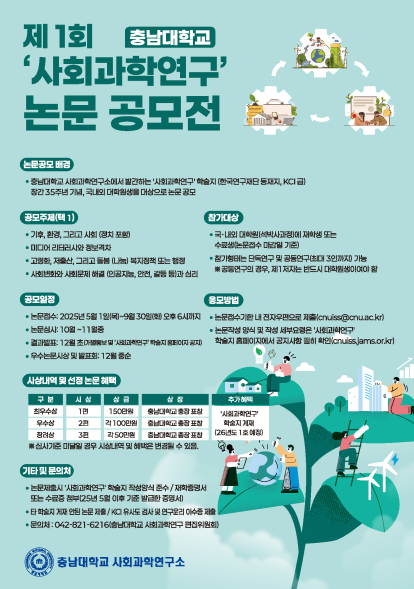 THE GRADUATE SCHOOL OF충남대학교 사회과학연구소 『사회과학연구』 학술지 창간 35주년을 기념하여 논문 공모전을 개최하오니, 전국 대학원생 여러분의 많은 참여 바랍니다.