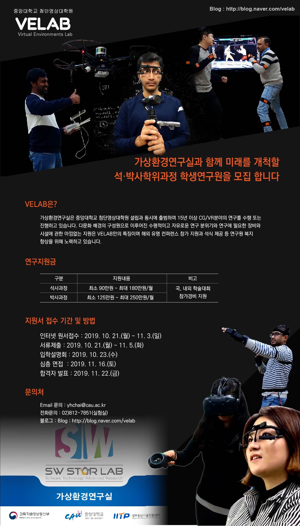 당신의 상상이 현실이 됩니다.[ 중앙대학교 첨단영상대학원 가상환경연구실 2020학년도 1학기 석박사 신입생모집 ] 인터넷 원서 접수 : 2019. 10. 21 (월) ~ 11. 3 (일) 입학설명회 : 2019. 10 . 23 (수) 서류 제출 : 2019. 10. 21 (월) ~ 11. 5 (화) 면접일 : 2019. 11 . 16 (토) 합격자발표 : 2019. 11. 22 (금) [ 문의처 ] Email 문의 : yhchai@cau.ac.kr 전화문의 : 02) 812-7851 (가상환경 실험실) 블로그 (Blog) : http://blog.naver.com/velab [입학안내] http://www.gsaim.cau.ac.kr/2015/b01.php [가상환경연구실 영상] https://www.youtube.com/watch?v=GqHatF1J_-U&feature=youtu.be