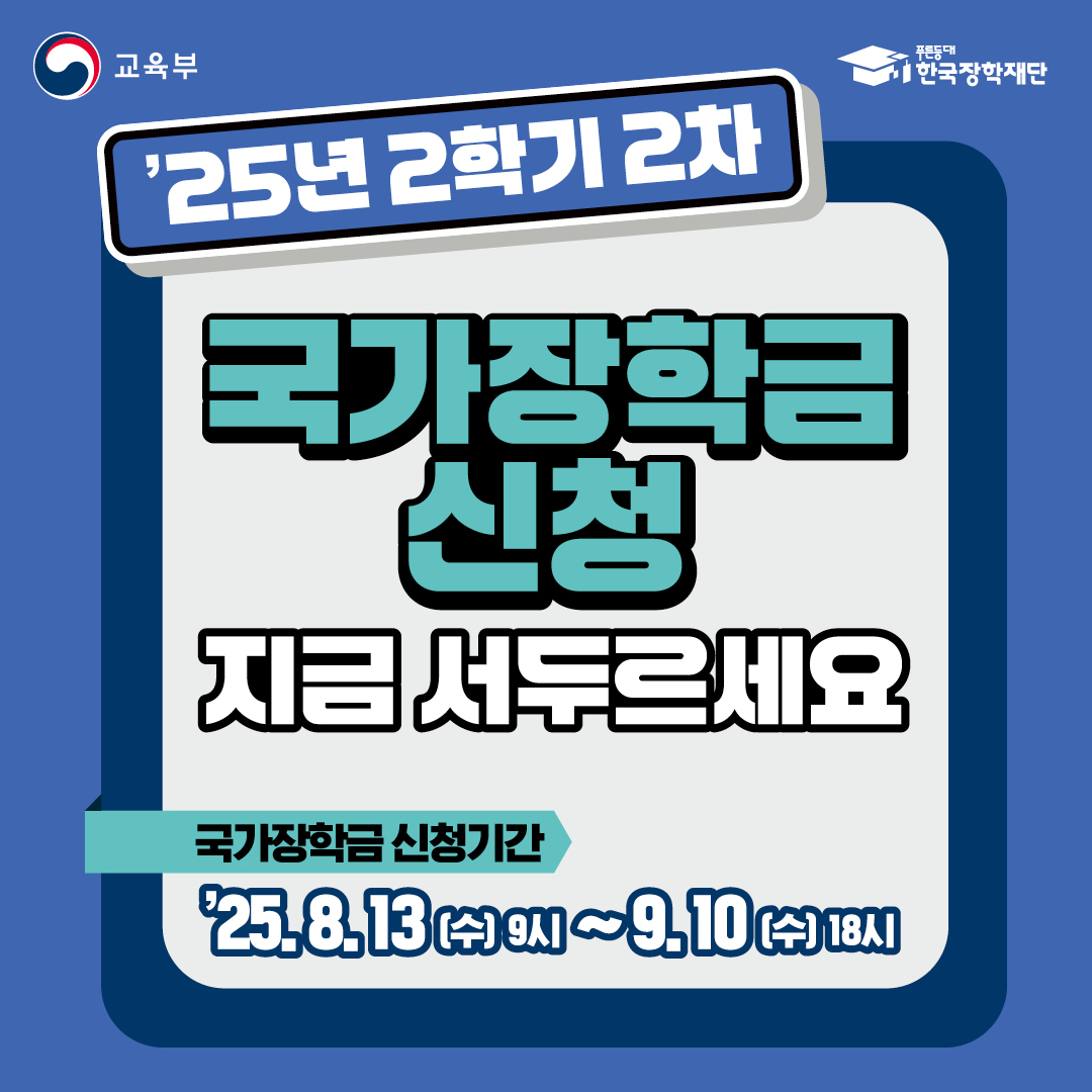 ※ 2025년부터 국가장학금 지원대상이 9구간까지 확대되고 2025-2학기 국가장학금 지원 단가가 인상 됐으니, 소득구간에 관계없이 재학생들은 확인 후 신청 부탁드립니다.