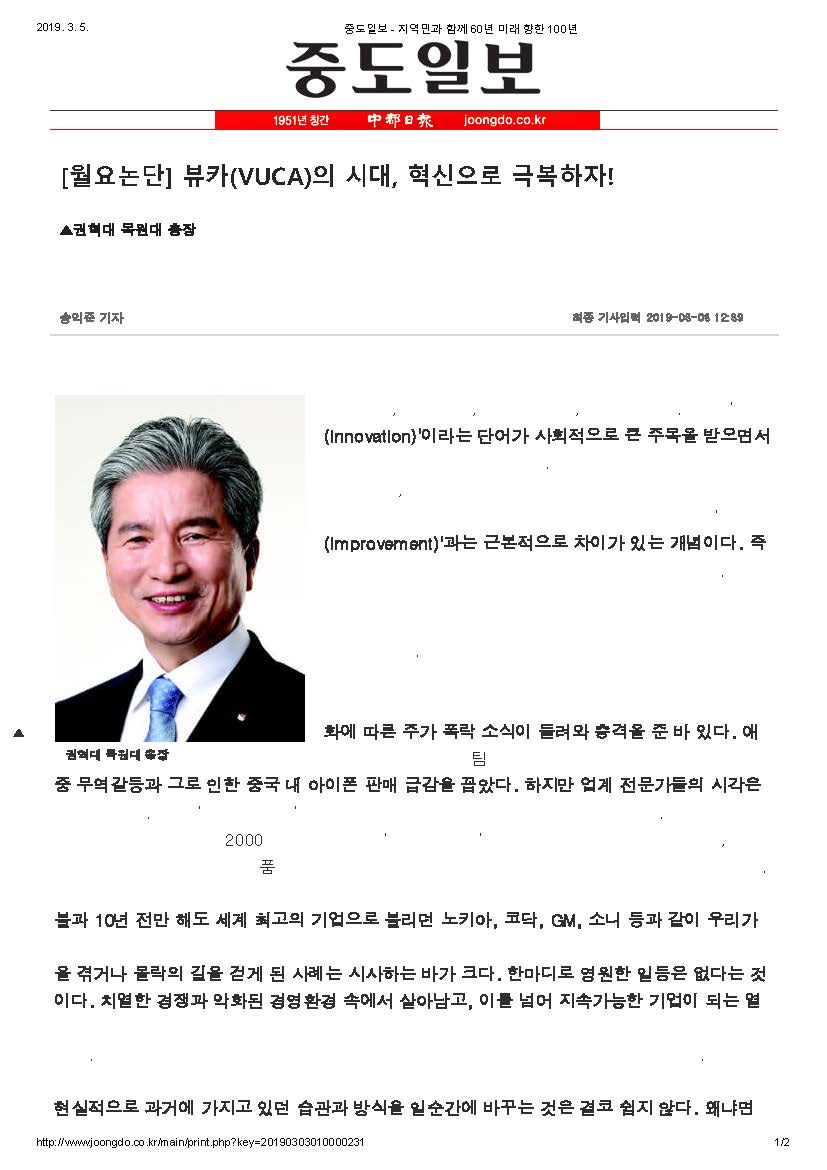 MOKWON UNIVERSITY혁신성장, 규제혁신, 개방형 혁신, 스마트 혁신. 요즘 "혁신(innovation)"이라는 단어가 사회적으로 큰 주목을 받으면서주변에서 심심찮게 듣게 된다. 사전적인 의미로 묵은 관습이나 조직, 방법 등을 완전히 바꿔서 새롭게 함을 뜻하는 혁신의 개념은 기존의 것을 좀 더 발전시켜 얻게 되는 "개선(improvement)"과는 근본적으로 차이가 있는 개념이다. 즉혁신이란 기존의 것과 전혀 다른 새로운 것을 말한다. 개인이나 조직이 처해 있는 환경 여건이 현재의 방식으로는 극복이 어렵다고 인식하게 될수록 혁신의 본질적 개념은 더욱와닿게 된다. 얼마 전 세계 최고의 선두기업이라 불리는 애플의 실적 악화에 따른 주가 폭락 소식이 들려와 충격을 준 바 있다. 애플의 최고경영자인 팀 쿡은 실적 부진의 주된 원인으로 미·중 무역갈등과 그로 인한 중국 내 아이폰 판매 급감을 꼽았다. 하지만 업계 전문가들의 시각은 자못 다르다. 바로 "혁신의 부재"를 애플이 맞은 위기의 근본 원인으로 보고 있다. 혁신의 아이콘이라 불리던 애플이 2000년대 초반 소위 "아이폰 혁명"으로 스마트폰 시대를 열었지만, 이후눈에 띌만한 혁신적인 신제품을 시장에 내놓지 못하게 되면서 시장의 신뢰를 잃었다는 것이다. 불과 10년 전만 해도 세계 최고의 기업으로 불리던 노키아, 코닥, GM, 소니 등과 같이 우리가잘 알고 있는 다수 글로벌 대기업마저도 시장 변화를 제대로 읽지 못하여 경영상 상당한 어려움을 겪거나 몰락의 길을 걷게 된 사례는 시사하는 바가 크다. 한마디로 영원한 일등은 없다는 것이다. 치열한 경쟁과 악화된 경영환경 속에서 살아남고, 이를 넘어 지속가능한 기업이 되는 열쇠는 시장의 수요와 환경변화에 발맞추어 적절히 대응할 수 있는 혁신의 실행에 달려있다는 것이다. 이처럼 환경변화에 대한 시의적절한 인식과 혁신은 떼려야 뗄 수 없는 관계이다. 현실적으로 과거에 가지고 있던 습관과 방식을 일순간에 바꾸는 것은 결코 쉽지 않다. 왜냐면 사람이나 조직이나 모두 새로운 변화보다는 기존의 익숙하고 편한 것을 계속 유지하고자 하는 관성을 기본적으로 가지고 있기 때문이다. 하지만 환경변화 신호를 정확히 인식하지 못하고, 그대로 머물러 있으면 생존마저도 위협을 받게 되는 것이 현실이다. 우리가 살아가는 현시대의 특징을 에둘러서 일명 "뷰카(VUCA: 변동성·불확실성·복잡성·모호성의 영문 첫 글자)의 시대"라 부른다. 과거에 비해 요즘은 하루가 다르게 새로운 기술이 등장하고 있으며, 조직을 운영하고 의사결정 하는 과정에 고려해야 할 요소가 너무도 다양하고 많아졌다. 한편 대학이라는 조직에서 주요하게 고려해야 할 대상은 학생과 기업이다. 대학에서 제공하는 교육의 대상은 학생이고, 교육을 통해 길러내는 인재에 대한 수요처는 기업이다. 필자가 총장 취임과 함께 내걸은 슬로건 또한 "맞춤인재를 양성하는 교육혁신대학"이다. 여기서 "맞춤"이라는 의미는 두 가지 의미를 내포하고 있다. 첫째는 교육수요자인 학생들의 눈높이에 맞춤화된 교육 내용과 방식을 제공하는 것이고, 둘째는 기업 등 인재수요자의 필요에 부합하는 실무형 인재를 양성하는 것이다. 대학이라는 조직이 상당히 보수적인 집단으로 인식되지만, 위기가 올 때 혁신은 더욱 빛을 발하는 것이다. 기존 교육의 방식과 틀을 근본적으로 다시 생각하며 변화에 대응하는 다양한 교육혁신을 시도해 보자는 것이다. 바야흐로 4차 산업혁명 시대를 맞이하였다. "혁명"이라는 단어가 의미하듯 그 파급효과는 산업,기술, 경제 등 모든 분야에 걸쳐 실로 광범위하게 전개될 것이다. 과거 어느 때보다 변화의 속도는 가속화되었고, 불확실성과 복잡성 또한 날로 증대되고 있다. 찰스 다윈은 가장 힘세거나영리한 종이 살아남는 것이 아니라 변화에 가장 민감한 종이 살아남는다고 하였다. 요즘같이예측이 불가능하고 불확실성이 가득한 이른바 뷰카(VUCA)의 위기 상황에서는 변화의 전조 증상을 얼마나 빨리 그리고 정확히 인지하고 혁신을 만들어 내느냐, 그것이 바로 핵심역량이자 가장 확실한 경쟁력일 것이다. (권혁대 목원대 총장) [기사 링크 : http://www.joongdo.co.kr/main/view.php?key=20190303010000231] |