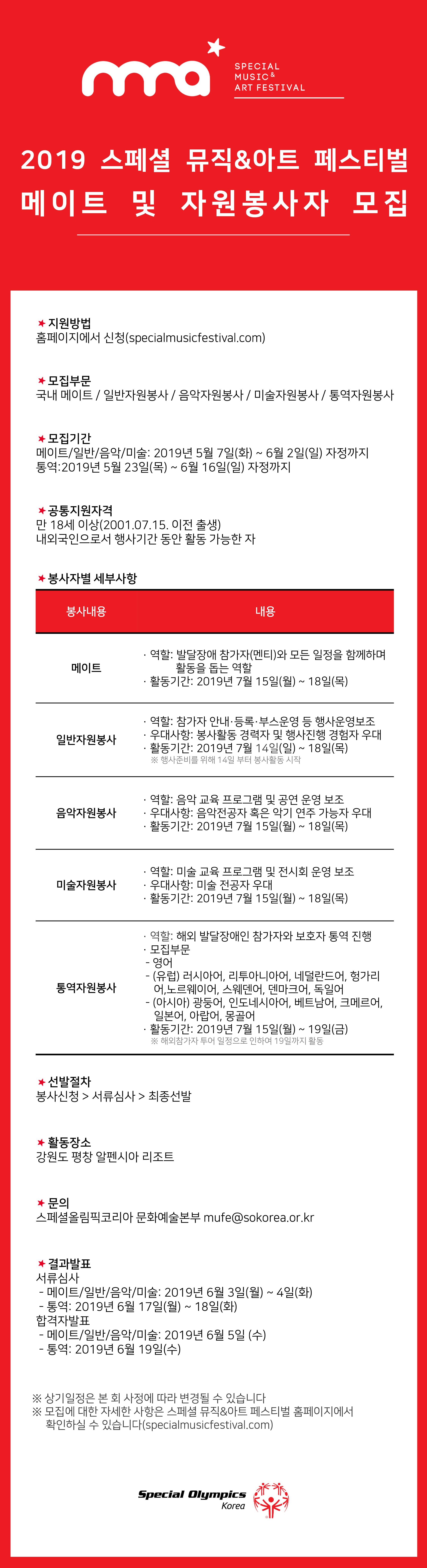 MOKWON UNIVERSITY발달장애인들과 함께하는 "2019 스페셜 뮤직&아트 페스티벌"에 자원봉사자를 모집합니다. 뜻깊은 자리에 많은 참여 부탁드립니다. 감사합니다. 가. 행 사 명 : 2019 스페셜 뮤직&아트 페스티벌 나. 행사기간 : 2019년 7월 15일(월) ~ 7월 18일(목) / 3박 4일 다. 모집기간 -메이트/일반/음악/미술 : 2019년 5월 7일(화) ~ 6월 2일(일) 자정까지 -통역자원봉사자 : 2019년 5월 23일(목) ~ 6월 16일(일)