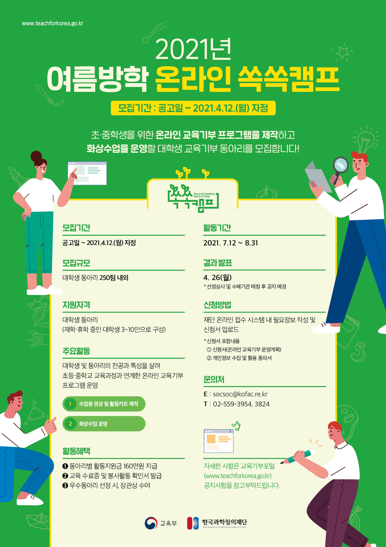 한국과학창의재단에서는 코로나19로 인한 교육 공백 해소 지원을 위하여 대학생이 직접 기획 및 운영하는 교육기부 프로그램인 '2021년 여름방학 온라인 쏙쏙캠프' 사업을 운영하고자 합니다.