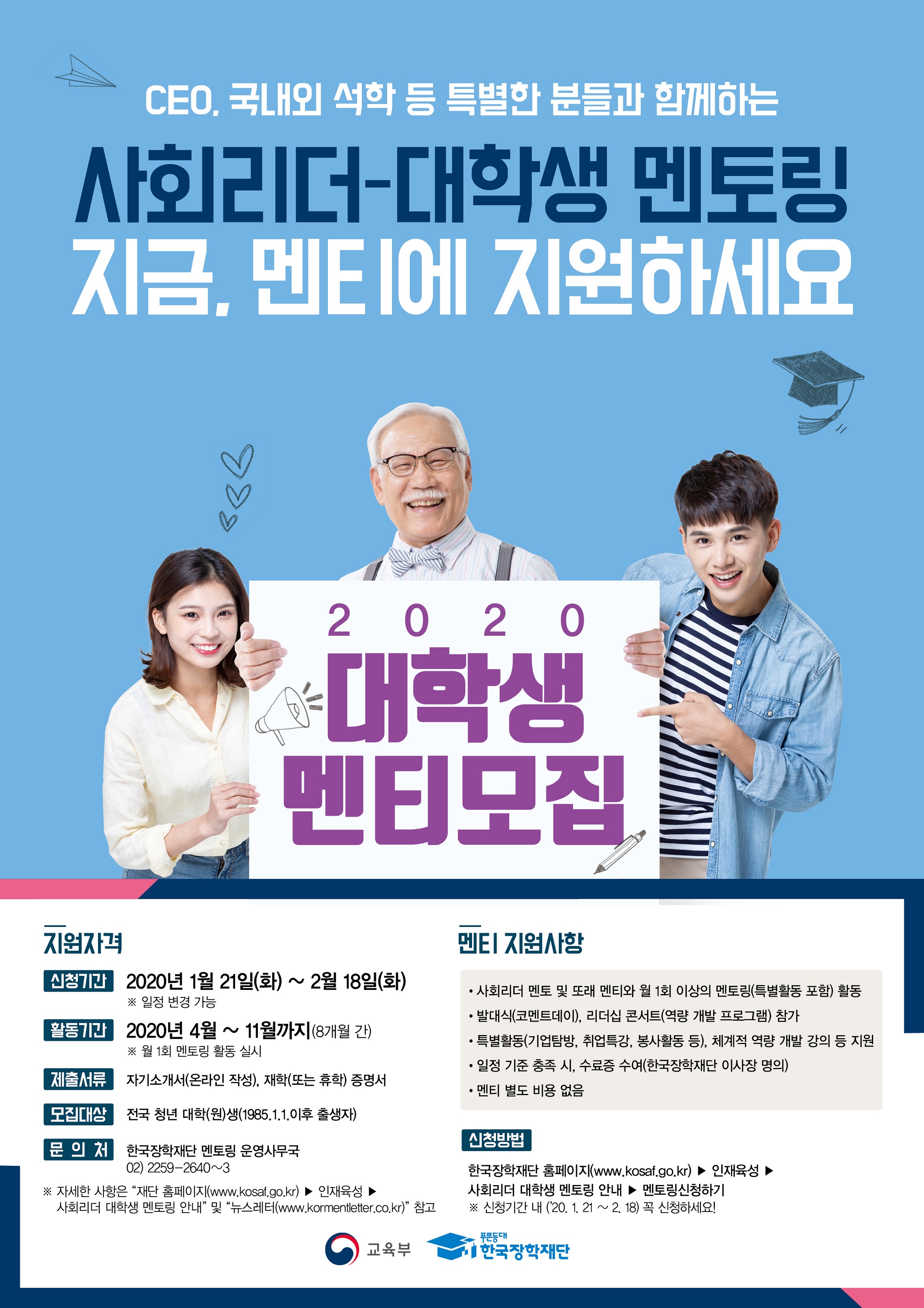 가. 멘티 모집요강 ㅇ 지원자격: 전국 청년 국내 대학(원)생(1985.1.1.이후 출생자에 한함) ※ 2020년 2월 졸업예정자 제외 ㅇ 신청기간: 2020. 1. 21.(화) 9:00 ~ 2. 18.(화) 24:00(단, 본교 취업지원과를 통해 신청하고자 하는 학생들은 2월5일(수)까지 취업지원과로 제출바라며, 개별적으로 신청하고자 하는 학생들은 2월18일(화)까지 한국장학재단 홈페이지를 통해 온라인 신청 ㅇ (추천 및 추천대상) 소속 대학 학생(재학생 및 휴학생) 중 멘티로 활동하고자 하는 학생 ※ 추천 기준은 대학 자율이며, 추천 인원 수는 제한 없음 ㅇ (선발우대) 대학이 추천한 학생의 경우, 멘티 선발 시 한국장학재단 기준을 준용하여 우대점수를 부여할 예정 ※ 단, 추천학생은 신청기한 내 홈페이지에서 신청완료 필수 ㅇ 신청방법: 한국장학재단 홈페이지(www.kosaf.go.kr)에서 온라인 신청 - 홈페이지 > 인재육성 > 사회리더 대학생 멘토링 > 멘토링 신청하기(PC에서만 접속 가능) ㅇ 제출서류 - (필수서류) 재학[또는 휴학]증명서 - (선택서류) 저소득층·장애인·다문화·탈북 증빙서류, 봉사활동 인증서 등 나. 멘티 지원사항 ㅇ 다양한 분야의 사회 지도층 멘토와 월 1회 이상 멘토링 활동(멘토 1명과 팀단위로 활동) ㅇ 발대식, 리더십콘서트 등 대규모 교육 프로그램 참가(비용 없음) ㅇ 체계적 역량개발 프로그램(기업탐방, 사회공헌활동 등) ㅇ 한국장학재단 이사장 명의 수료증 발급(수료기준 충족 시) 다. 문 의: 취업지원과 ☏7152, 7155