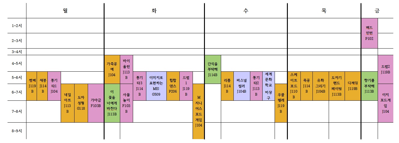 세계문화학교 수업이 수 5시~7시에서 수 6시~8시로 변경되었습니다. 목요일 디제잉 수업 5시~7시(X) 6시~8시 입니다 혼동을 드려 죄송합니다 시간표 첨부파일 참고바랍니다~!! |
