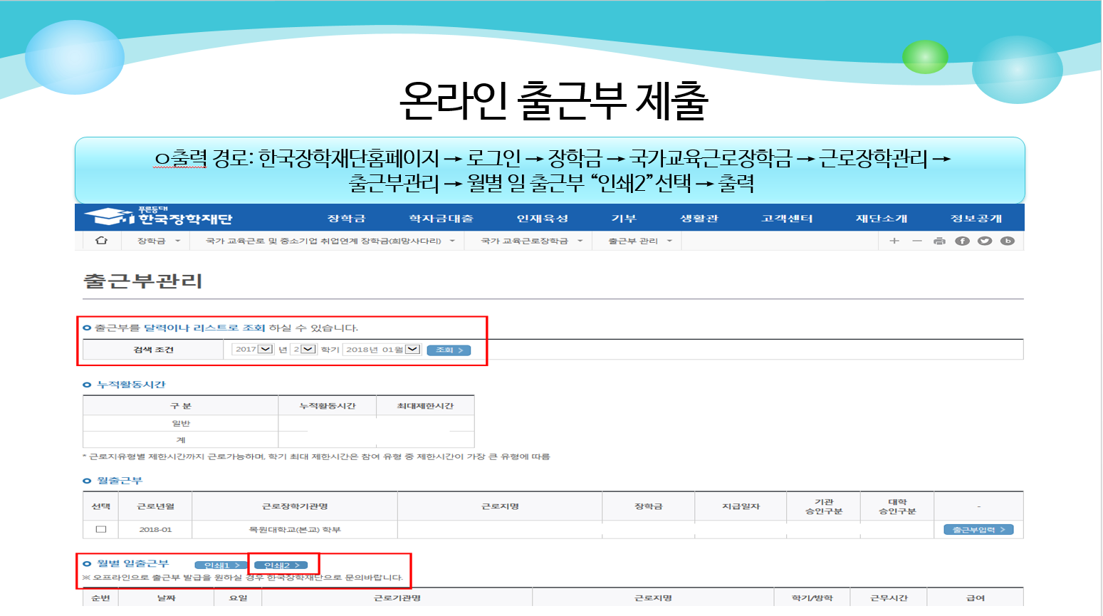 *반드시 출근부에 담당자와 책임자의 도장이나 서명을 받아 원본을 장학지원과로 제출 **출근부 미 제출 시, 장학금 지급 불가능함 ***직접 제출 불가 시, 장학지원과로 전화 후 빠른 등기로 제출 가능