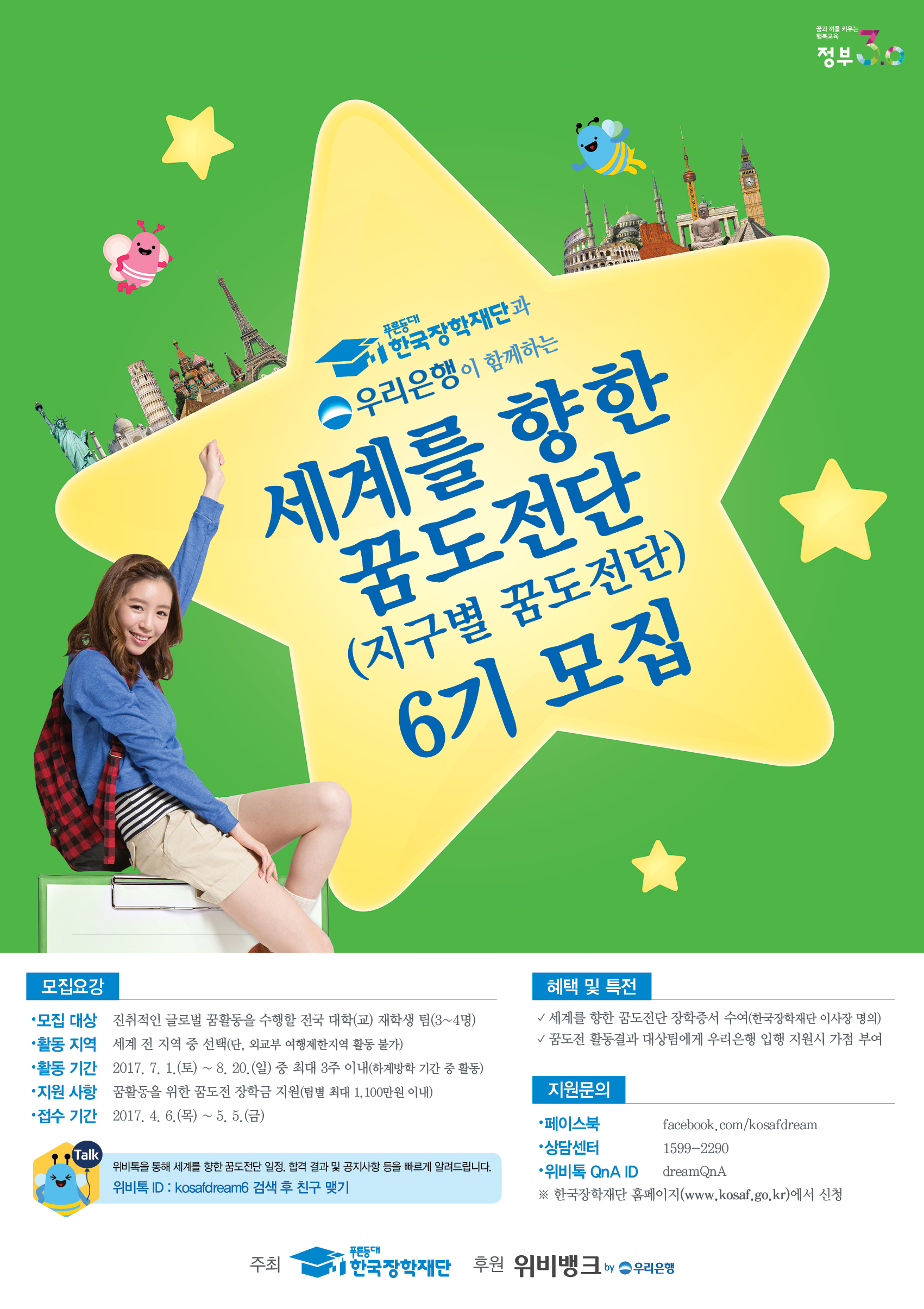 □ 모집대상 : 전국 대학(교) 재학생 팀(3~4명) □ 신청기간 : 2017. 4. 6.(목) ~ 5. 5.(금) 24시까지 □ 신청방법 : 1. 한국장학재단 홈페이지(www.kosaf.go.kr) 메인화면 우측 하단 ‘세계를 향한 꿈도전단(지구별 꿈도전단)’ 클릭 2. ‘세계를 향한 꿈도전단(지구별 꿈도전단)’ 페이지로 이동 후 ‘지원하기’를 통해 접수 □ 지원사항 : 꿈활동을 위한 꿈도전 장학금 지원(팀별 최대 1,100만원 이내)