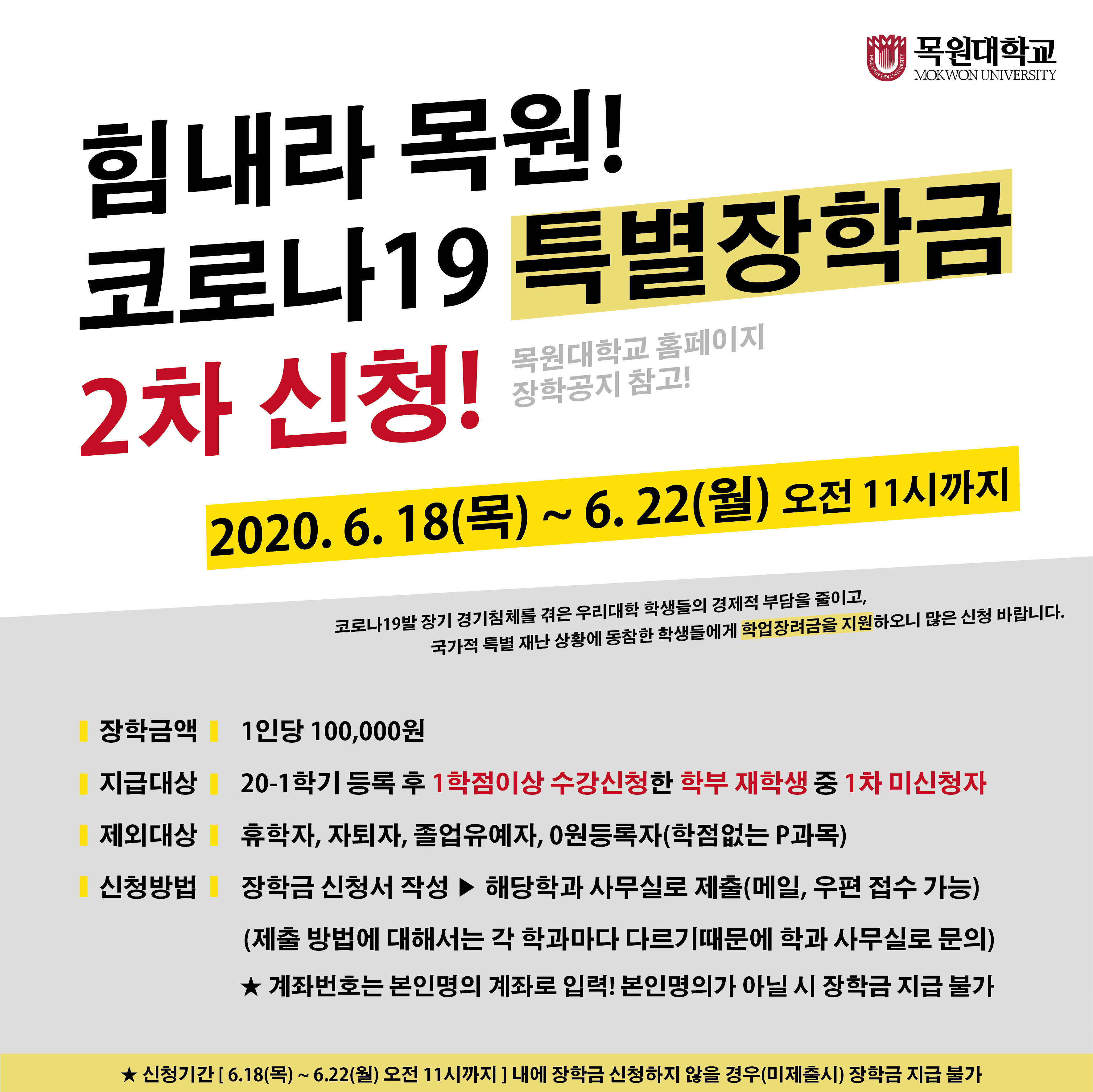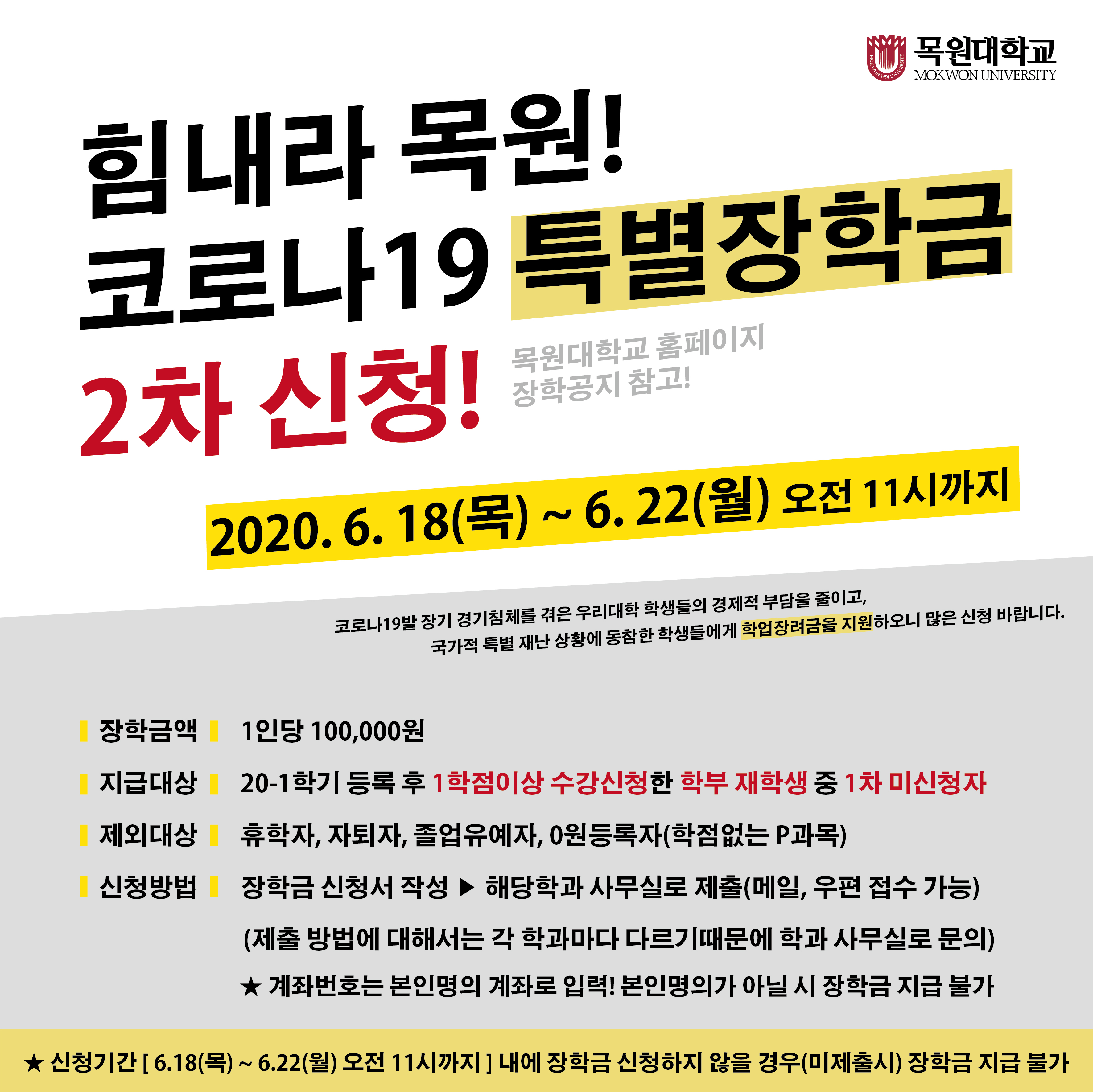 MOKWON UNIVERSITY1. 해당 교내장학금명 : 코로나19 특별장학금 2차 신청 2. 장학금액 : 1인당 100,000원 3. 신청대상 • 2020-1학기 등록하고 1학점 이상 수강 신청한 학부 재학생 약 7,200명 (소득분위, 성적제한 없음) 중 1차 미신청자 • 2020-1학기 복학한 학생 중 휴학학기에 미리 납부한 등록금이 존재하여, 2020-1학기 등록금이 0원 처리된 학생 포함 (단, 학점없는 P과목 0원등록자 제외) 4. 제외대상 • 휴학자, 자퇴자, 졸업유예자, 0원 등록자(학점없는 P과목), 대학원생 5. 신청기간 : 2020. 6. 18(목) ~ 6. 22(월) 오전 11시까지 (신청서를 학과사무실로 제출) 6. 신청방법 : 코로나19특별장학금 신청서(첨부파일) 작성 ▶ 해당학과 사무실로 제출 (메일, 우편 접수 가능) * 2차신청은 네이버 폼 신청이 아닙니다. 신청서 서류(아래의 첨부파일)를 제출해야 하오니 유의해 주세요! * 제출방법은 각 소속 학과마다 다름!! 학과로 문의해 주세요! 7. 지급방법 : 신청서에 입력한 본인명의 계좌로 이체 (본인계좌가 아닐 경우 장학금 지급불가)