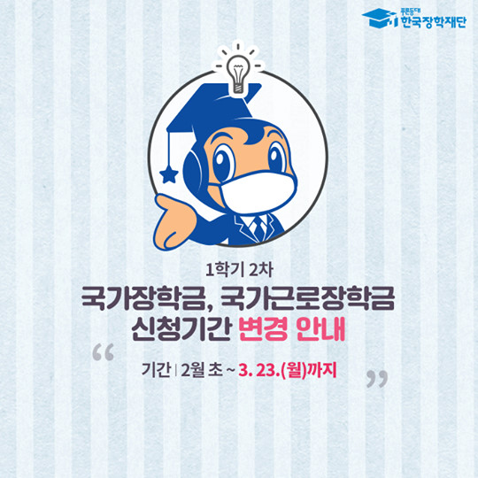 코로나19 감염증 확산으로 대학이 개강을 연기함에 따라,국가장학금 신청기한이 연장되었습니다.⠀ 변경된 일정을 확인 후 신청 시 착오 없으시길 바랍니다. ⠀ 1. 신청기간 : 20. 2. 3.(월) ~ 3. 23.(월)까지 (주말 및 공휴일 포함 24시간 신청 가능, 마지막날은 18시에 마감)
