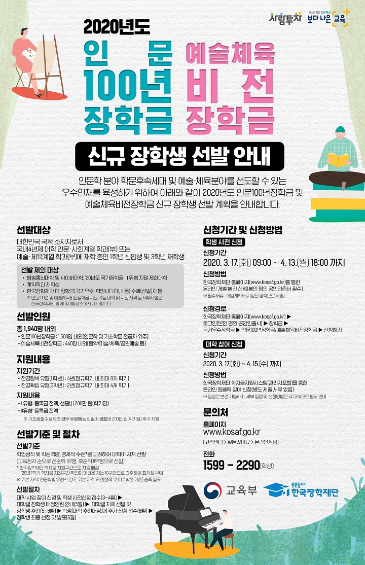 2020년 우수학생 국가장학금(인문100년, 예술체육비전) 학생 사전신청 안내