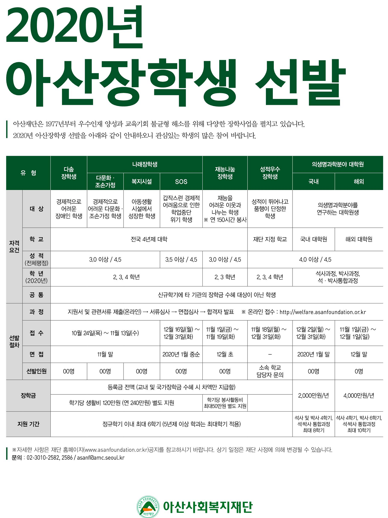*SOS 장학생 1) 부모의 사업실패 ․ 질병 ․ 재해 등 갑작스러운 경제적 어려움으로 학업을 중단할 위기에 놓인 학생 2) 전국의 4년제 대학에 재학 중으로 2020년 신규학기에 3,4학년이며, 전체 학업성적 평점이 3.5/4.5 이상인 학생 3) 신규학기에 타 기관 장학금 수혜 대상이 아닌 학생 4) 접수기간 : 12월 18일(수) ~ 12월 31일(화)