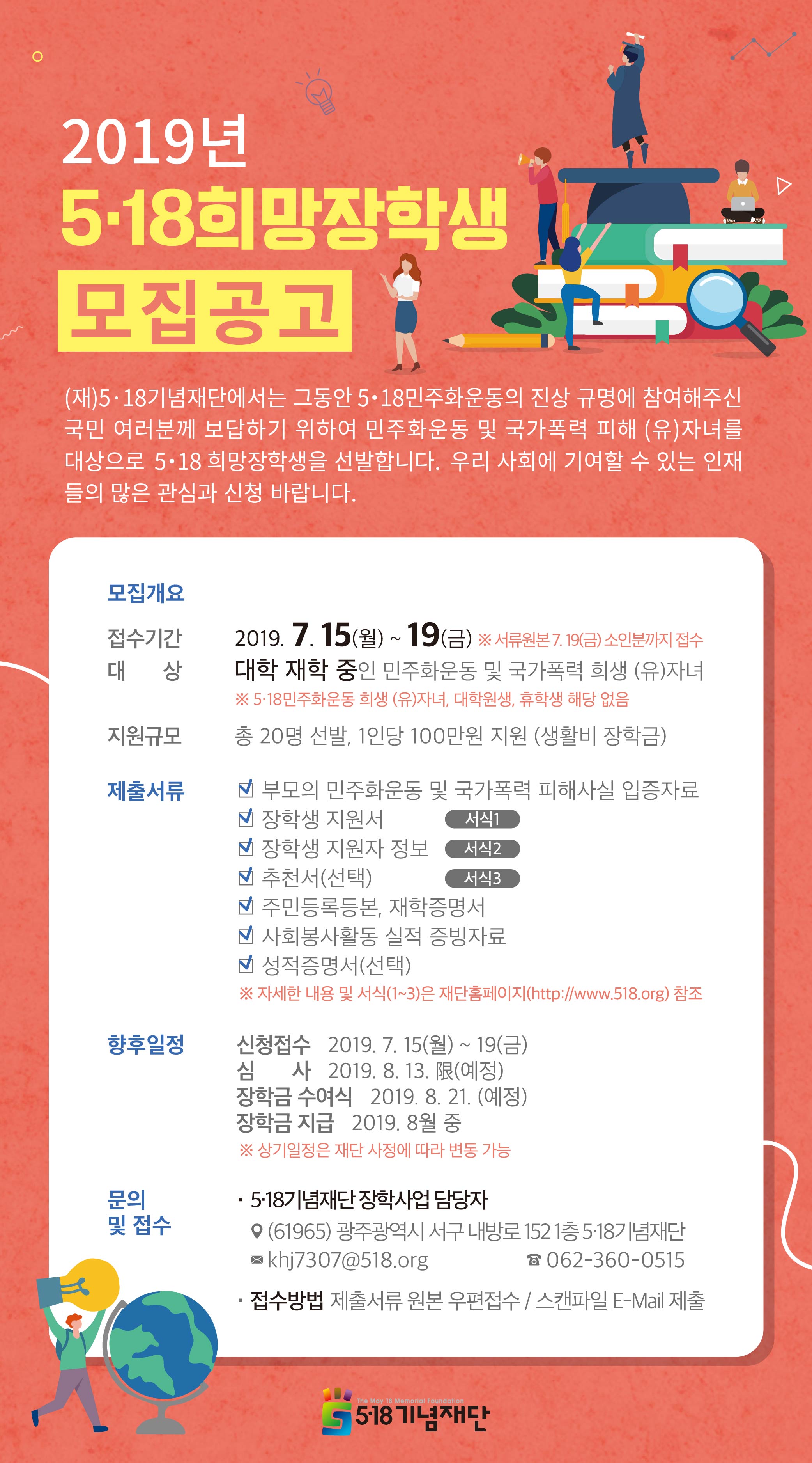 ○ 문의 및 접수처 : 5·18기념재단 장학사업 담당자(☎062-360-0515)