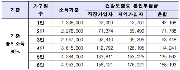 2. 지원자격 ○ 소득기준 - 아래 ①와 ②의 조건을 모두 충족해야 신청 가능함. ① 가구 월평균 소득이 2018년도 중위소득의 80% 이하 ② 월 건강보험료 기준 이하인 가정(단위:원)