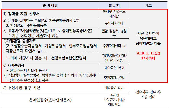 ※ 아래 "서류 접수 및 신청 절차" 참조하여 준비서류 학교로 제출(2019. 1. 11.(금) 17시까지)