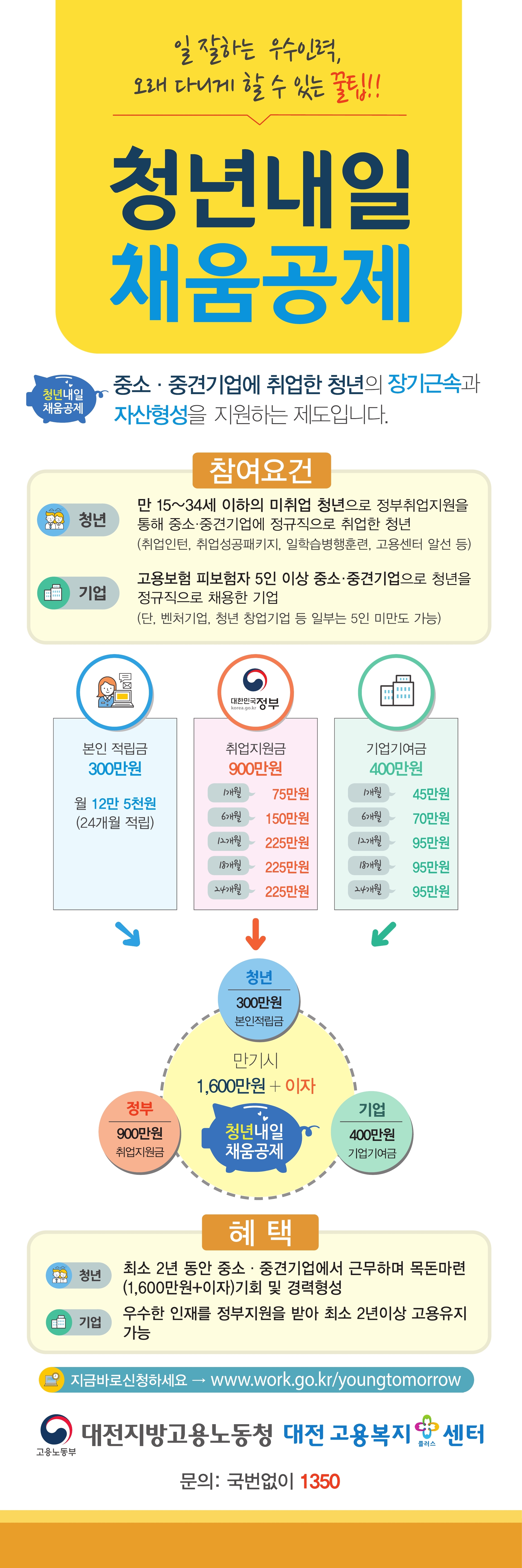 ★ 청년내일채움공제란?- 중소·중견기업에 취업한 청년 근로자의 장기근속을 위하여 고용노동부와 중소벤처기업부가 공동으로 운영하는 공제. - 청년근로자와 사업주 및 정부가 공동으로 적립한 공제금에 복리이자를 더하여 2년 이상 장기재직한 근로자에게 성과보상금 형태로 만기 공제금(1,600만원 + 이자) 지급