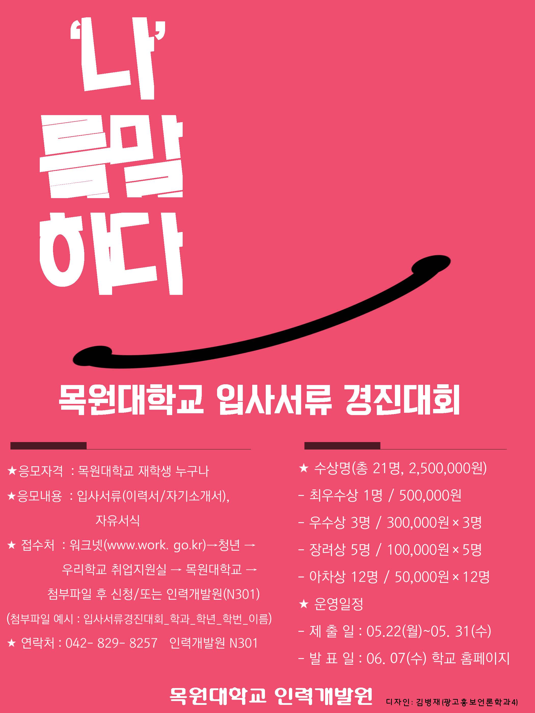 MOKWON UNIVERSITY1. 프로그램 : 제12회 입사서류(이력서/자기소개서) 경진대회 2. 대 상 : 재학생 누구나 가능 3. 접수기간 : 2017. 05. 22(월) ~ 05. 31(수)까지 4. 접 수 처 : 워크넷(www.work.go.kr) : 신청방법 붙임 참조 또는 인력개발원(N301) 방문 접수 된 이력서 자기소개서는 경진대회 이후 첨삭하여 학생메일로 발송 예정 파일명 : 입사서류 경진대회_학과_학년_학번_이름 5. 제출서류 : 입사서류(이력서/자기소개서)-자유서식 6. 심사기준 가. 이력서 : 형식성(사진 부착, 지원분야 등), 항목별 충실도, 문서편집 능력 나. 자기소개서 : 항목별 충실도, 자기(직무역량 위주) 표현력, 직무(지식, 기술, 태도)적합성 다. 총 수상인원 : 21명(이력서 점수 + 자기소개서 점수 = 총점 고득점 자 순으로 선발) 라. 기타 1) 총점이 동점일 때는 자기소개서 점수 우선 2) 내용이 심사기준에 적합하지 않을 시 수상자가 없거나 적을 수도 있음 3) 경진대회 참여자에게는 마일리지 부여 7. 수상내역 : 상장 + 장학금(일금이백오십만원정(2,500,000))