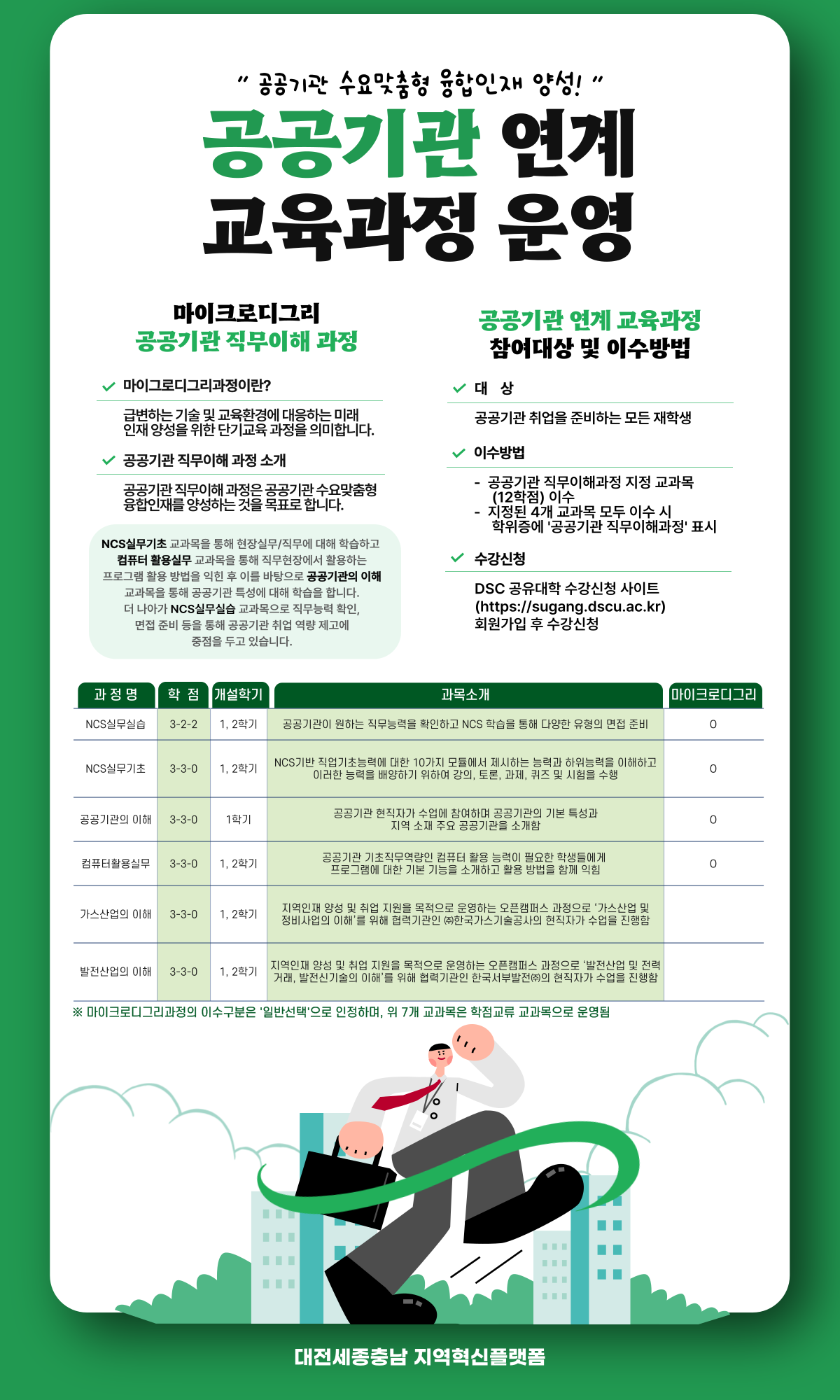 MOKWON UNIVERSITY지자체-대학 협력기반 지역혁신(RIS)사업의 일환으로 지역수요 맞춤형 인재를 양성하고자 공공기관 연계 교육과정(학점교류)을 다음과 같이 운영합니다, 또한 일부 교과목은 마이크로디그리로 인정되는 교과목이니 관심있는 학생들은 참여하여 주시기 바랍니다.