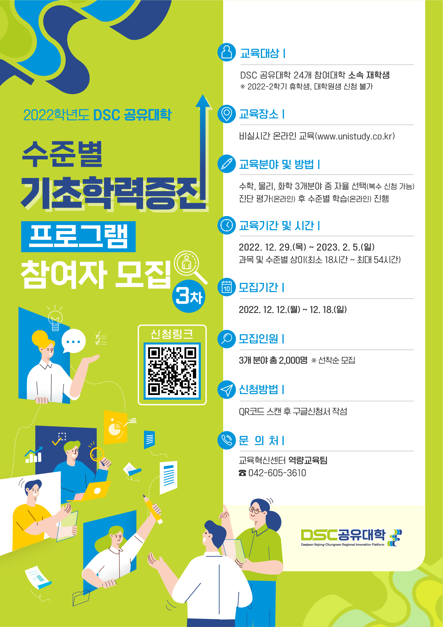 사. 문 의 처: DSC 지역혁신플랫폼 대학교육혁신본부 교육혁신센터 역량교육팀(042-605-3610, dscu@cnu.ac.kr)