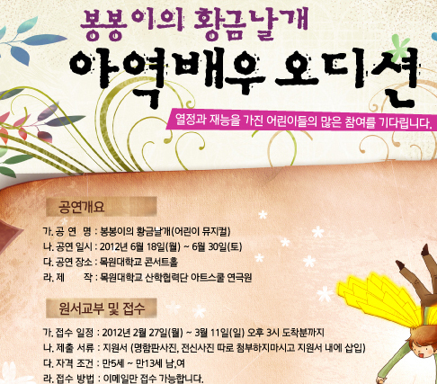 우리대학에서는 지역 어린이들이 공연에 직접 참여여 경험할 수 있는 기회를 제공하기 위해 공연에 참여할 열정과 재능이 많은 아역배우를 공개 오디션을 통해 선발한다. 오디션 서류 접수는 2월27일부터 3월11일까지 이메일(pymlike@mokwon.ac.kr)을 통해 접수하면 된다.