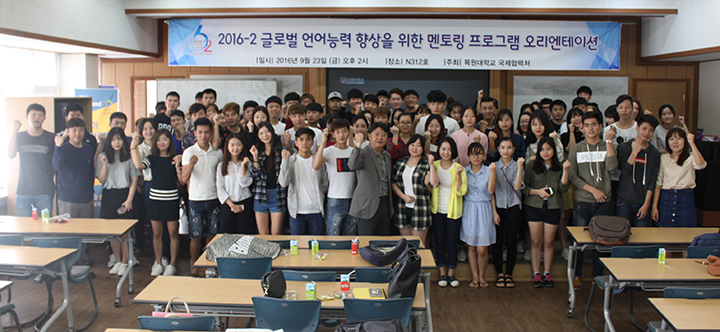 국제협력처, 글로벌 언어능력 향상을 위한 멘토-멘티 오리엔테이션 개최   우리 대학 국제협력처에서는 23일 오후2시 학생회관 312호에서 재학생 및 외국인 유학생 110여명이 참석한 가운데 ‘2016학년도 2학기 글로벌 언어능력향상을 위한 멘토-멘티 오리엔테이션’을 가졌다.  "글로벌 언어능력향상을 위한 멘토-멘티 프로그램"은 한국 학생들이 외국인 유학생들과 1:1 매칭으로 이루어져 외국인 유학생을 통해 외국어 능력을 향상하고 다문화에 대한 이해력을 증진시킬 뿐만 글로벌 리더십을 강화하는 프로그램이다.