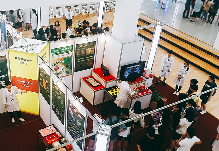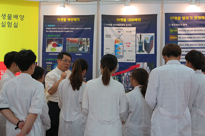 우리 대학 미생물나노소재학과, 『제5회 미생물과 생명산업 과학캠프』 개최 우리 대학 미생물나노소재학과(학과장 정상호)는 23일(토) 건축도시연구센터 1층 전시실에서 『제5회 미생물과 생명산업』 과학캠프를 개최하였다. 미생물나노소재학과는 학부생들이 미생물학 강의를 통해 습득한 이론적 지식을 다양한 분야의 미생물 생명산업체와 연계하여 미생물 소재의 활용과 비전을 직접 체험할 수 있도록 매년 과학캠프를 진행하고 있다. 특히, 이번 행사에는 미생물 생명공학에 관심이 있는 동대전고 외 15개 고등학교 3학년 학생들 200여명이 방문하여 대학 전공 결정을 위한 멘토-멘티 활동을 진행하였다. 이번 과학캠프에서 학생들은 미생물나노소재학과 전공교수들의 미생물과 생명산업 특강, 현미경 관찰을 통한 미생물 세계 관찰, 유용미생물 유전자원 확보를 위해 연구 개발하고 있는 국가지정 연구소 미생물생태자원연구소 탐방 등의 시간을 가졌다. 또한, 이번 캠프에서는 ㈜성심당 외 4개 기업으로부터 지원받은 다양한 발효식품들과 ㈜카프코 외 5개 친환경 유기농자재 회사에서 개발·생산되고 있는 농업바이오 제품, 나노헬릭스 외 3개의 이화학기기 회사에서 제작된 실험기기가 전시되었다. 미생물나노소재학과 재학생들은 미생물 산업체와 연계하여 준비한 이번 행사에서 고교생들에게 미생물의 힘을 설명하면서 전공에 대한 자긍심과 미래 진로에 대한 구체적인 계획을 갖게 되는 계기가 되었다. 한편, 2010년도에 신설된 우리대학 미생물나노소재학과는 미생물 유전자원 분야의 전문가를 육성하여 2016년 6월 공시기준 취업률 100%를 달성한 유망 학과이며, 교육부 추진 지방대학 특성화 지원 사업(CK-I)에 선정되어 2014년부터 5년간 “미래 생명자원 발굴·활용 전문인력 양성사업단”을 운영중에 있다. |
