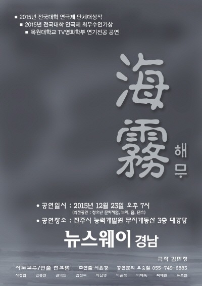 우리대학 TV영화학부는 경남 진주시에서 23일 오후 7시 능력개발원 무지개동산 대강당에서 일반시민 및 학생들을 대상으로 2015년 전국 대학연극제 단체대상 및 최우수상, 연기상 등 3관왕을 수상한 연극 ‘해무’를 공연한다.
