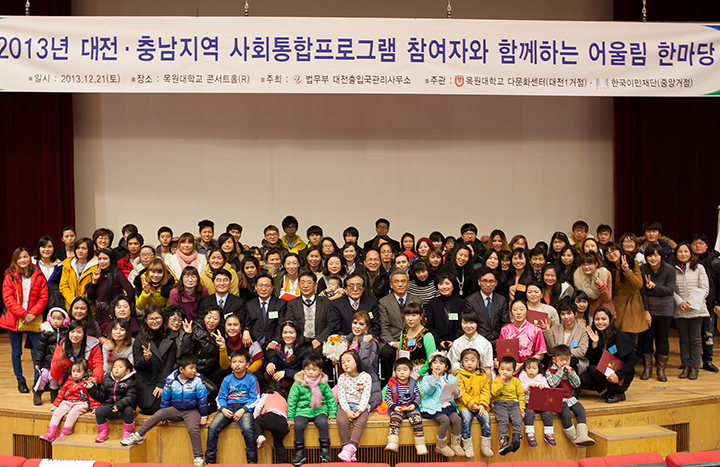 우리대학 다문화사회통합연구교육센터(이희학 센터장)는 <2013년 대전·충남지역 이민자 사회통합프로그램 참여자와 함께하는 어울림 한마당>을 12월 21일(토) 2시부터 5시 까지 목원대학교 콘서트홀에서 개최했다. 이번 이민자 어울림 한마당 행사는 법무부 지정 사회통합프로그램 대전1거점운영기관으로서 대전출입국 관리사무소와 공동으로 주관한 것이다. 어울림 한마당은 2013년 사회통합프로그램(한국어, 한국사회 이해)에 참여한 이민자들의 학습 노력과 성과를 제고하고 그에 따른 격려 차원에서 마련된 자리로서 수료식, 한국어 말하기 그 외 장기자랑 대회 순으로 200여명이 참석한 가운데 진행 되었다. 수료식에 이어 한국어 말하기, 장기자랑 대회에는 각각 10팀이 출천하여 한국에서의 삶과 사회통합프로그램의 참여수기, 춤과 노래 등 다양한 끼를 보여주는 화합과 소통의 축제 자리 가 되었다. 사회통합프로그램이란 이민자들이 한국 사회에 적응함에 있어서 요구되는 한국어와 한국사회 이해 등을 체계적으로 교육하며 한국생활에 유용한 정보를 제공하기 위한 목적으로 설계된 법무부의 이민자를 위한 통합적 프로그램으로이다. 또한 우리대학은 2009년 시범교육기관으로 선정된 이후 현재 대전1 거점운영기관으로 8개 일반운영기관과 함께 이민자 대상 교육을 확대 실시하고 있다. 우리대학 다문화센터는 2007년 개소이후 지역 내 거주하는 이민자의 교육과 복지 등에 있어 최선을 다하고 있고 대학원 이민다문화정책학과 운영하는 등 다문화에 있어 허브대학으로 도약 중에 있다. 그 외 2011년 이후 교육과학기술부와 연계하여 다문화 탈북학생 멘토링 지원사업을 수행 중에 있다. |