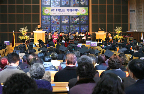 우리 대학의 ""2011학년도 학위수여식""이 2월 23일(목) 오전 11시부터 박거종 이사장과 김신호 대전광역시교육감, 이화식 기독교대한감리회 총무, 한재룡 기독교대한감리회 남선교회 전국연합회 총무, 김성수 총동문회 사무총장과 졸업생, 학부모 등 1,000여명이 참석한 가운데 교내 채플에서 열렸다.