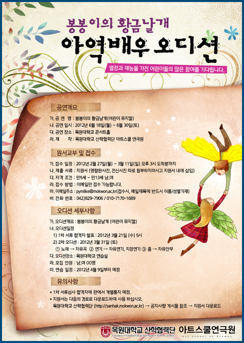 우리대학에서는 지역 어린이들이 공연에 직접 참여여 경험할 수 있는 기회를 제공하기 위해 공연에 참여할 열정과 재능이 많은 아역배우를 공개 오디션을 통해 선발한다. 오디션 서류 접수는 2월27일부터 3월11일까지 이메일(pymlike@mokwon.ac.kr)을 통해 접수하면 된다.