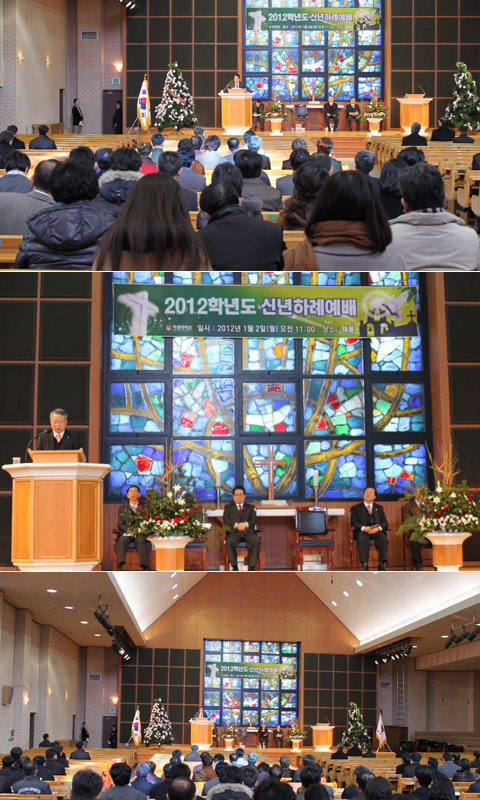 1월 2일(월) 오전 11시부터 우리 대학 채플에서는 박거종 이사장과 김원배 총장을 비롯한 교수 및 직원 등 200여명이 참석한 가운데 이광주 교목실장의 집례로 2012년도를 시작하는 신년 하례 예배를 가졌다.