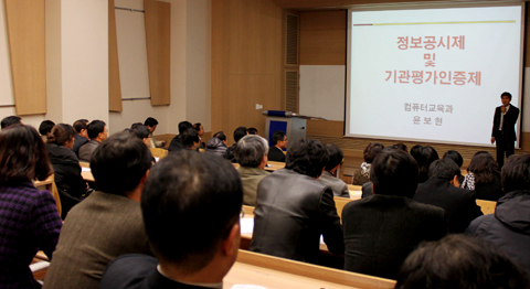 이어 윤보현 교수(컴퓨터교육과)가 ‘정보공시와 대학기관평가인증제’라는 주제로 PT를 진행하였고, 설명이 종료된 후 실무담당자들 간의 토론이 이어졌다.